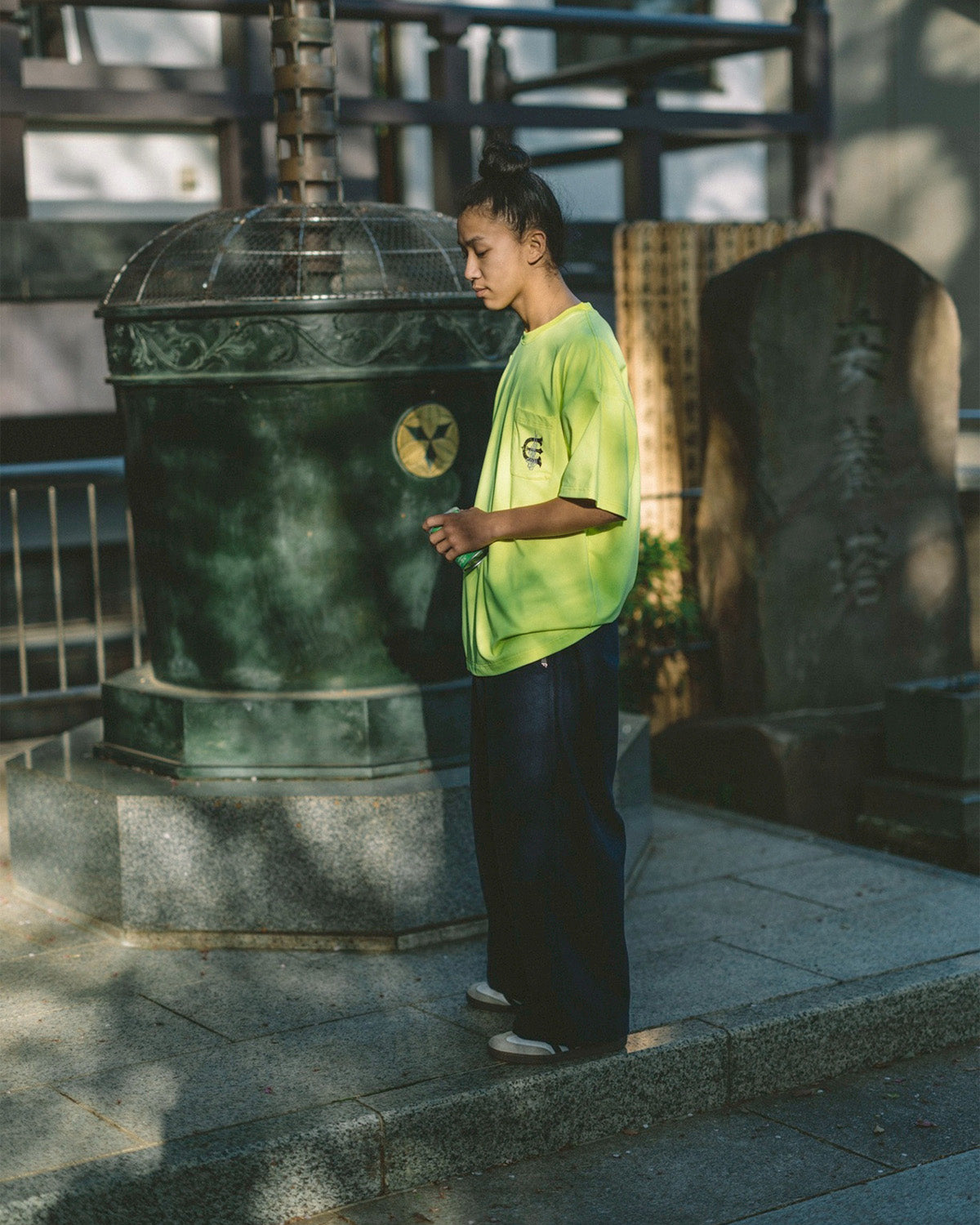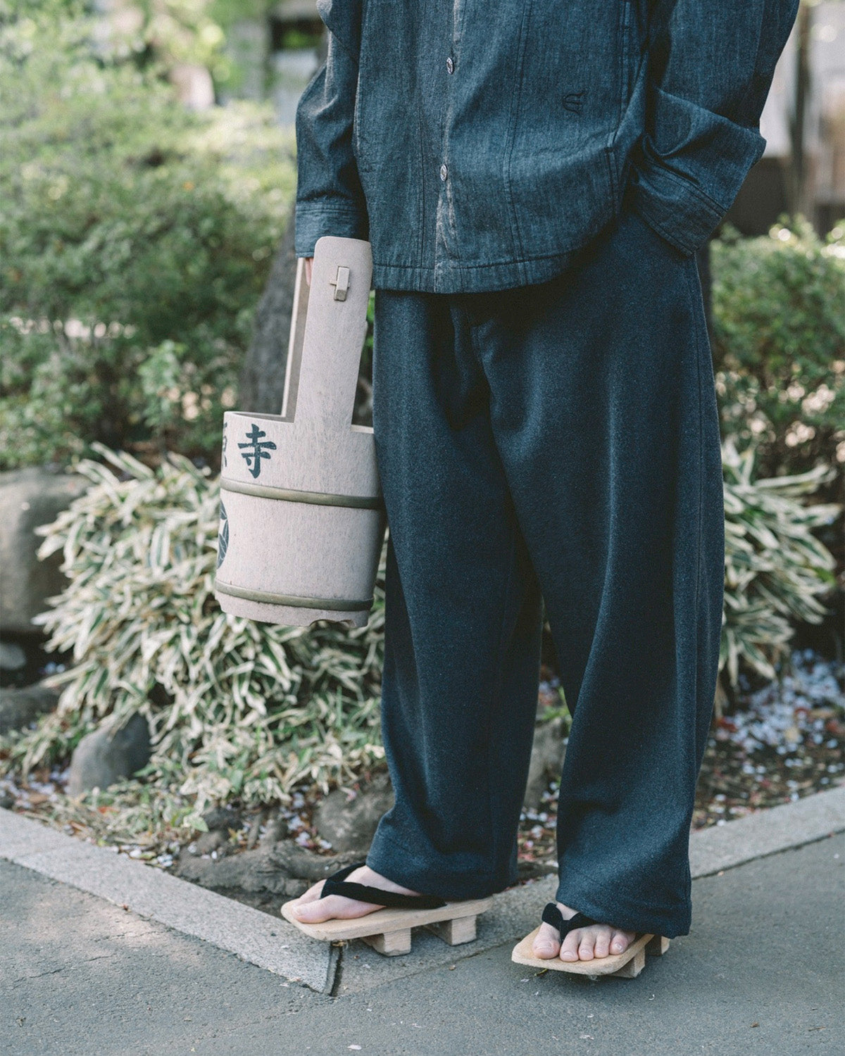 温かみのあるウール混のフランネル生地を使った新型のワイドパンツ。ウエストにはベルトループと内出しの腰紐付き。フロントはフライファスナー仕様で、タックボタンもロゴ入りのオリジナルデザイン。前後左右の腰ポケットに加え、左サイドシームに沿ったジップポケット付き。膝付近まで裏地素材を使用し、ウール独特の肌触りにも対応。右腰にはシルバーの“ゑ”刺繍入り。裾はアジャスター付きドローコード搭載なので、裾までワイドに広げて街で遊んで、スケボーするときはちょっと絞る、なんてのも可能です。