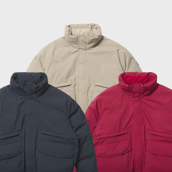 ファスナーとスナップボタンで着脱可能なフードの仕様により、違った印象で着こなせるあったかダウンジャケット。