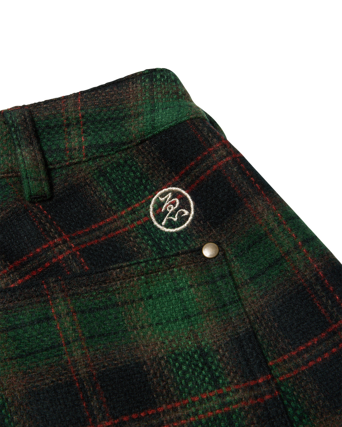 股上浅めのワイドストレートシルエット。 やや厚手で温かみのあるフランネルチェック柄生地を使用しています。ウエストにはベルトループと内出しの腰紐付き。フロントはフライファスナー仕様タックボタンもロゴ入りのオリジナルデザイン。