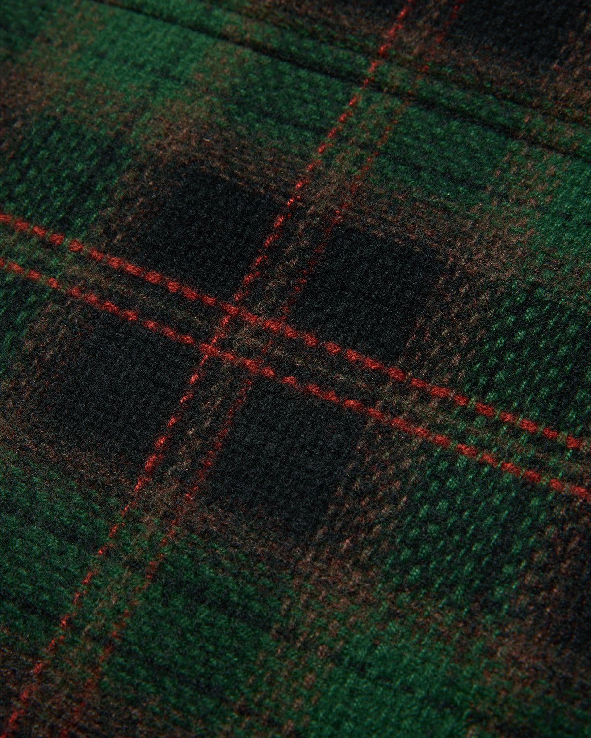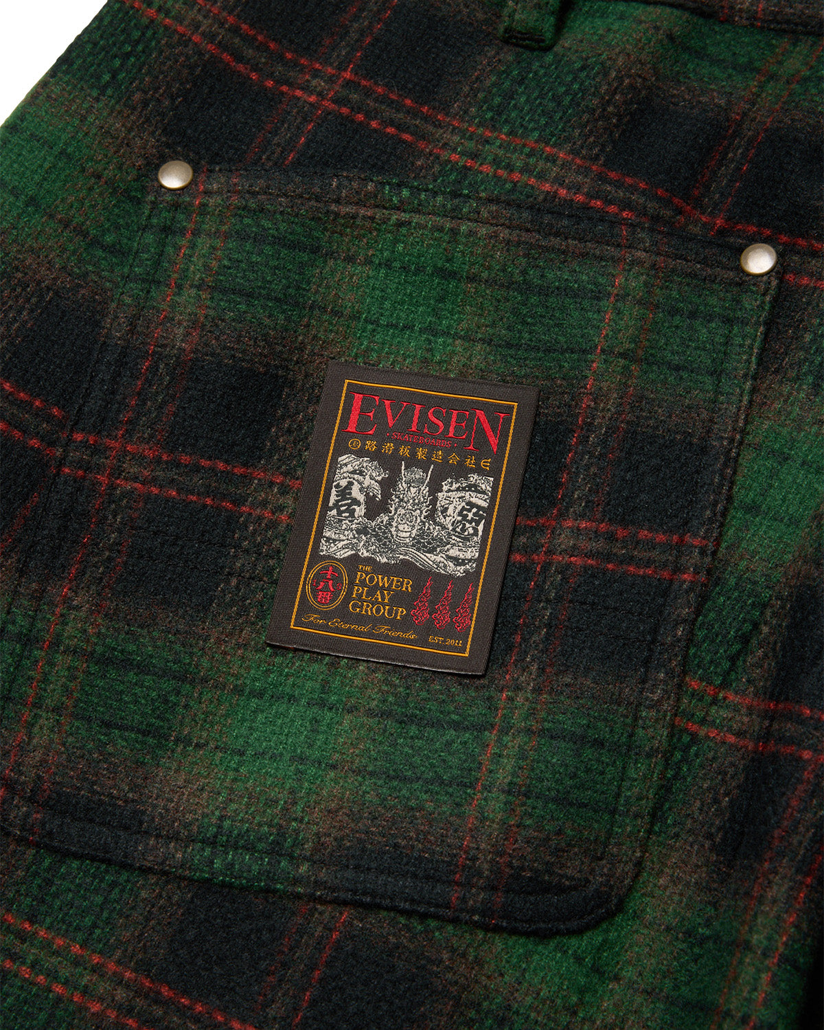 左のバックポケットにはドラゴンの織ネームを付け、右腰にはシルバーの“ゑ”刺繍入り。同じフランネル素材のジャケットと合わせたセットアップコーディネートもできます。