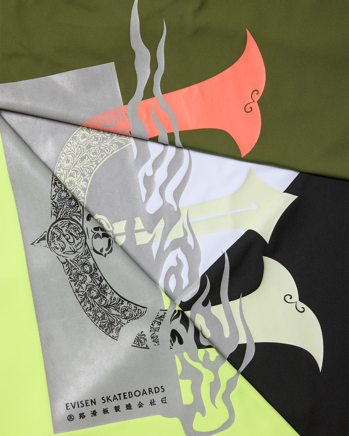 胸のパッチポケットとバックに、Eye FireとRectangle Logoを重ねたグラフィックをプリントしました
