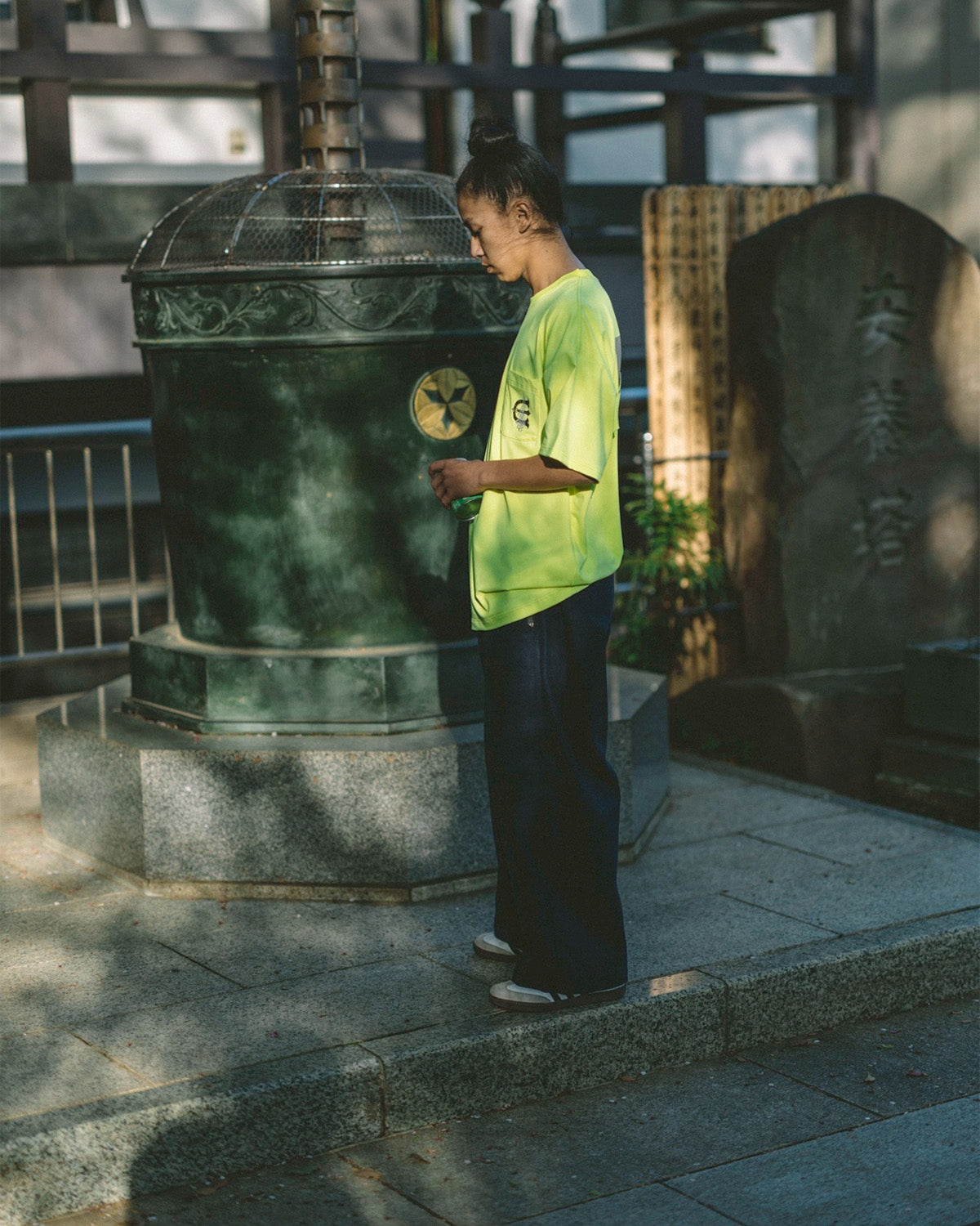 (ブラックとホワイトのボディにプリントしたEロゴ部分のみ、蓄光素材のギミック付きです)。程よくワイドなシルエット。右下サイドシームにピスネーム付き。