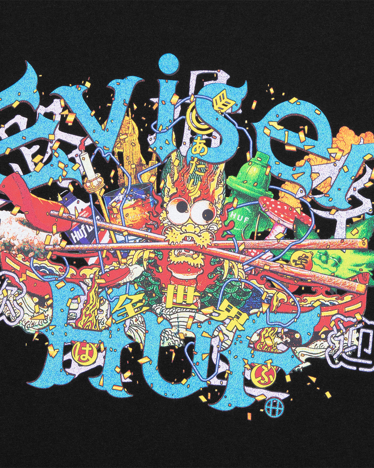 ・フロント中央にHUF X EVISEN DRAGONの多彩なグラフィックデザイン。