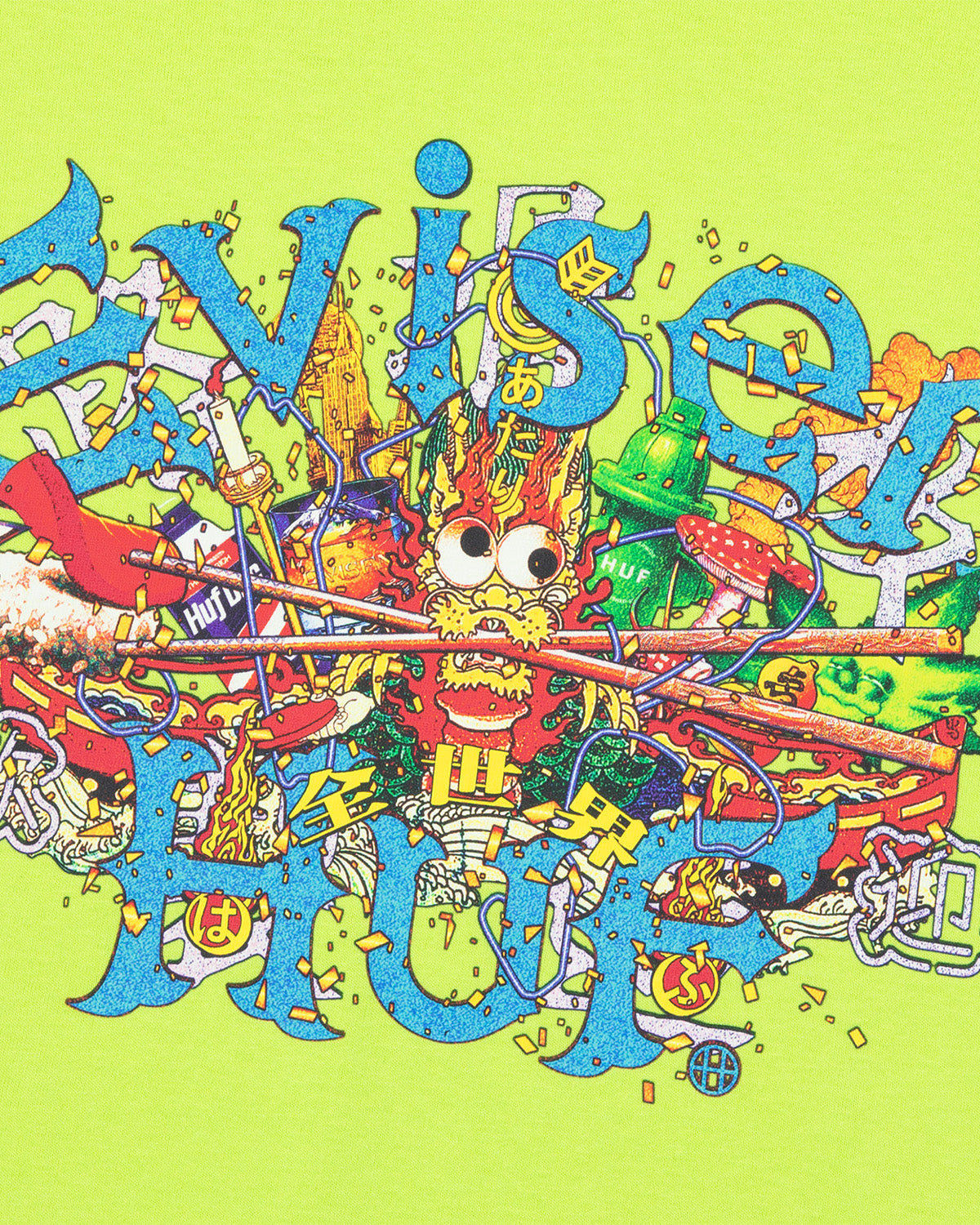 ・フロント中央にHUF X EVISEN DRAGONの多彩なグラフィックデザイン。