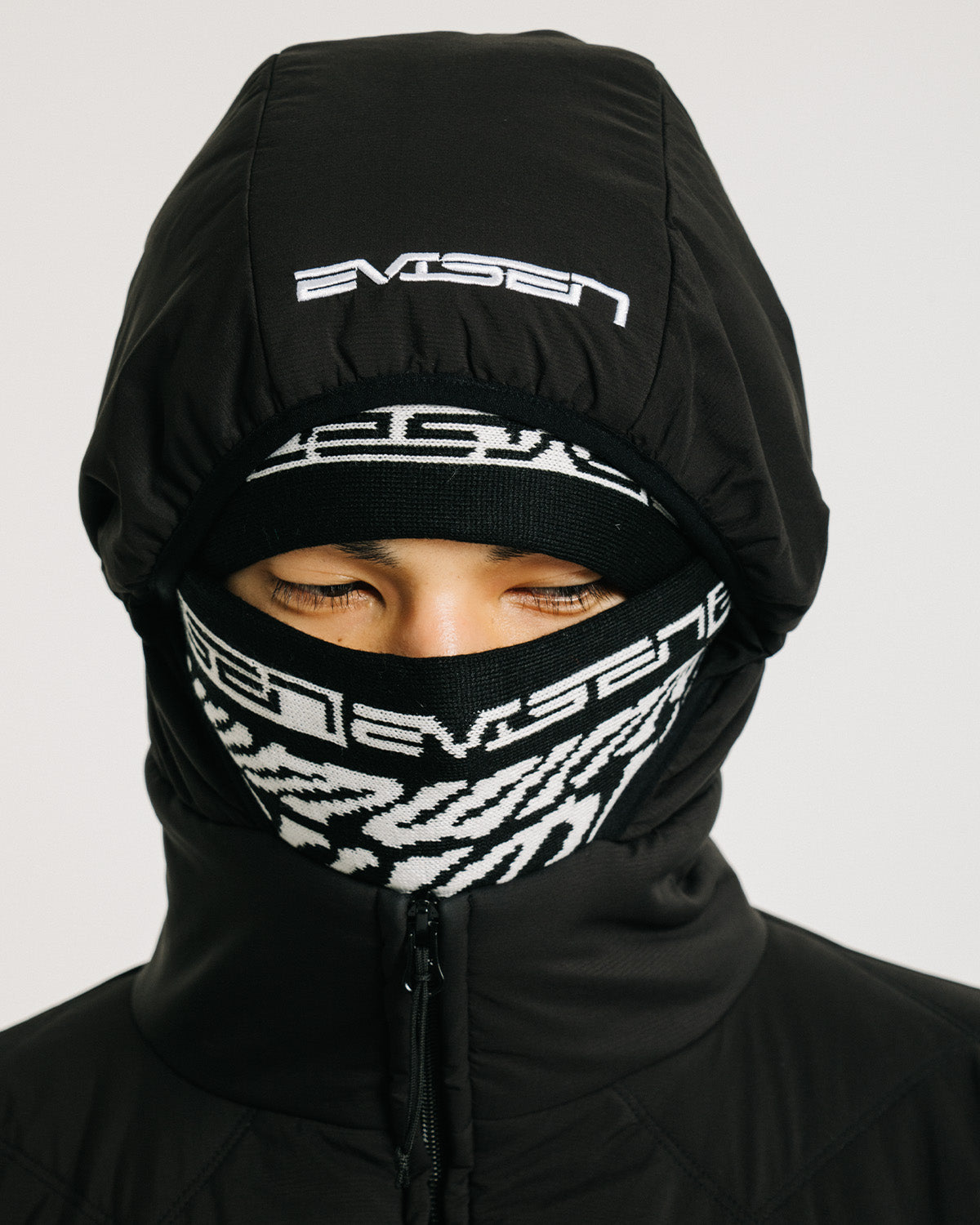 フードは高い位 置までファスナーを閉められるため首周りが温かく、後頭部のドローコードでフィット感も調 整可能。フード正面には Evisen の刺繍入り。