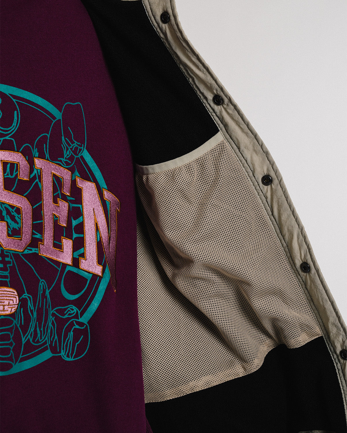 天日干ししたような質感の表生地は、ストレッチ性と撥水性のある快適 素材です。中綿には軽さと暖かさが魅力のシンサレートTMを採用。