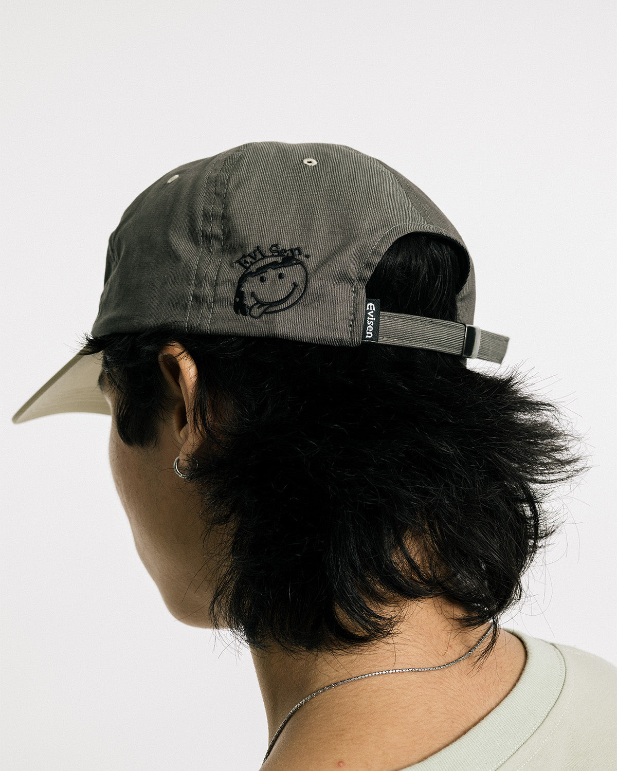 フロントの歪んだEロゴと、サイドパネルの曲がったニコちゃん刺繍がポイント。吸水速乾性のある快適素材COOLMAX®を使用しています。
