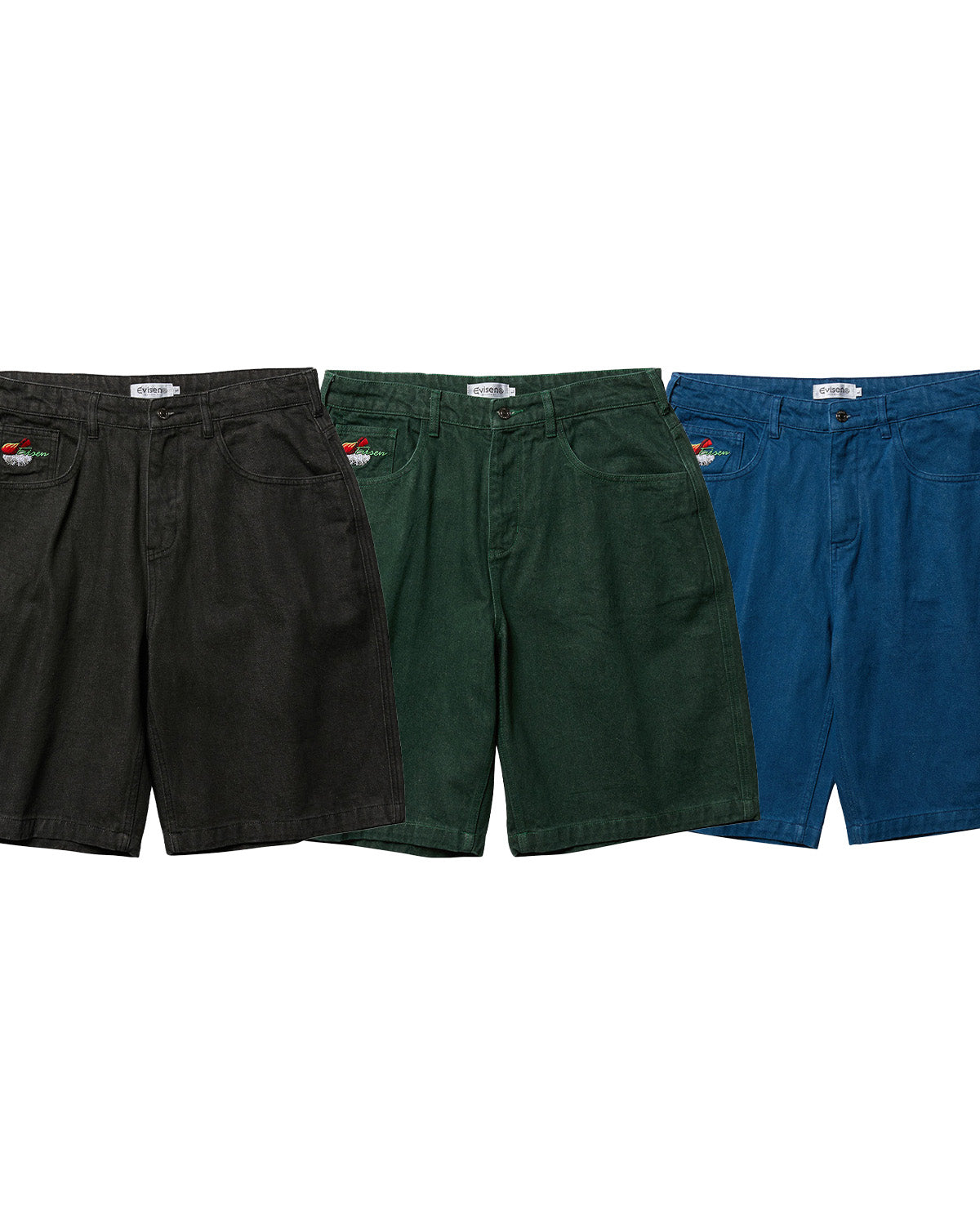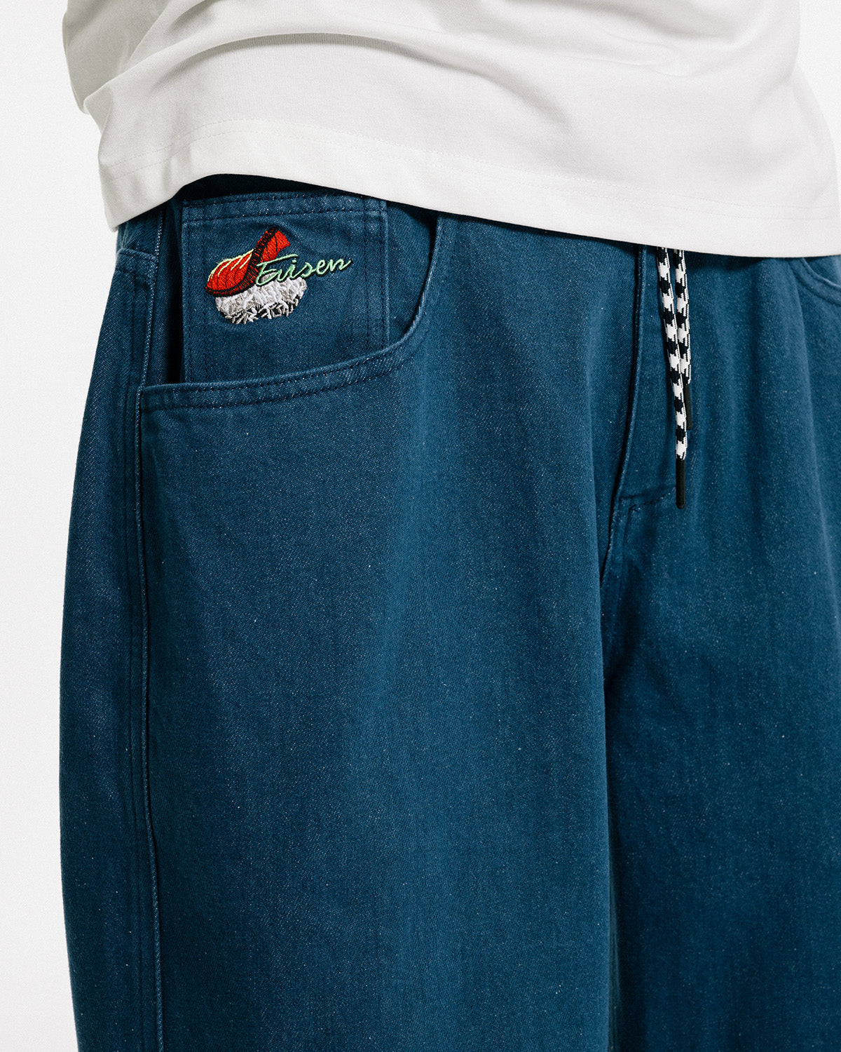 スシ刺繍入りのライトウェイトなコットンショーツ。ベーシックな5ポケットデニムスタイルで、コインポケットにスシ刺繍を施しています。