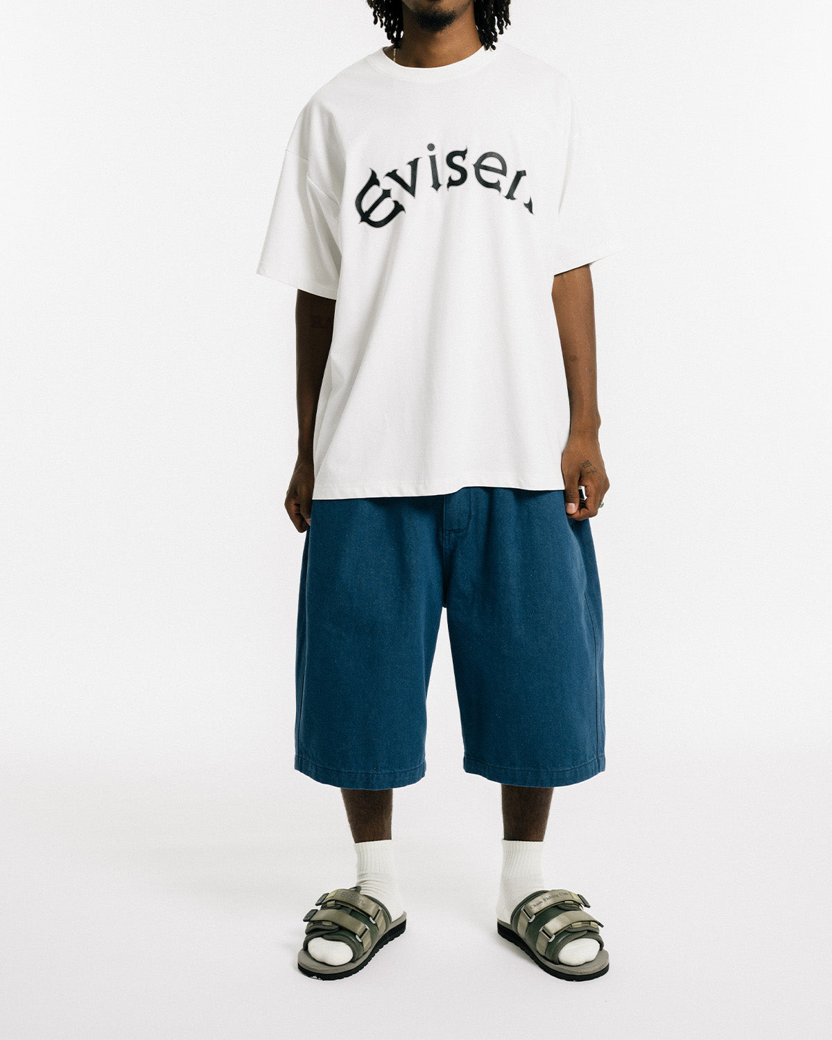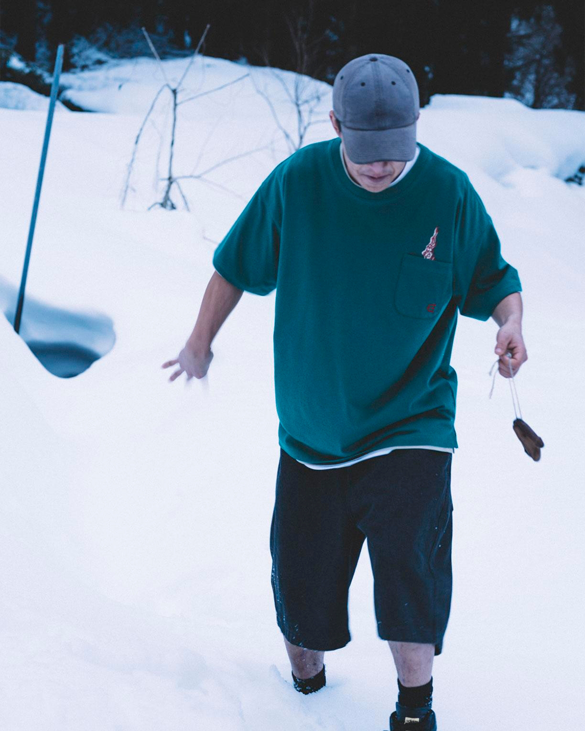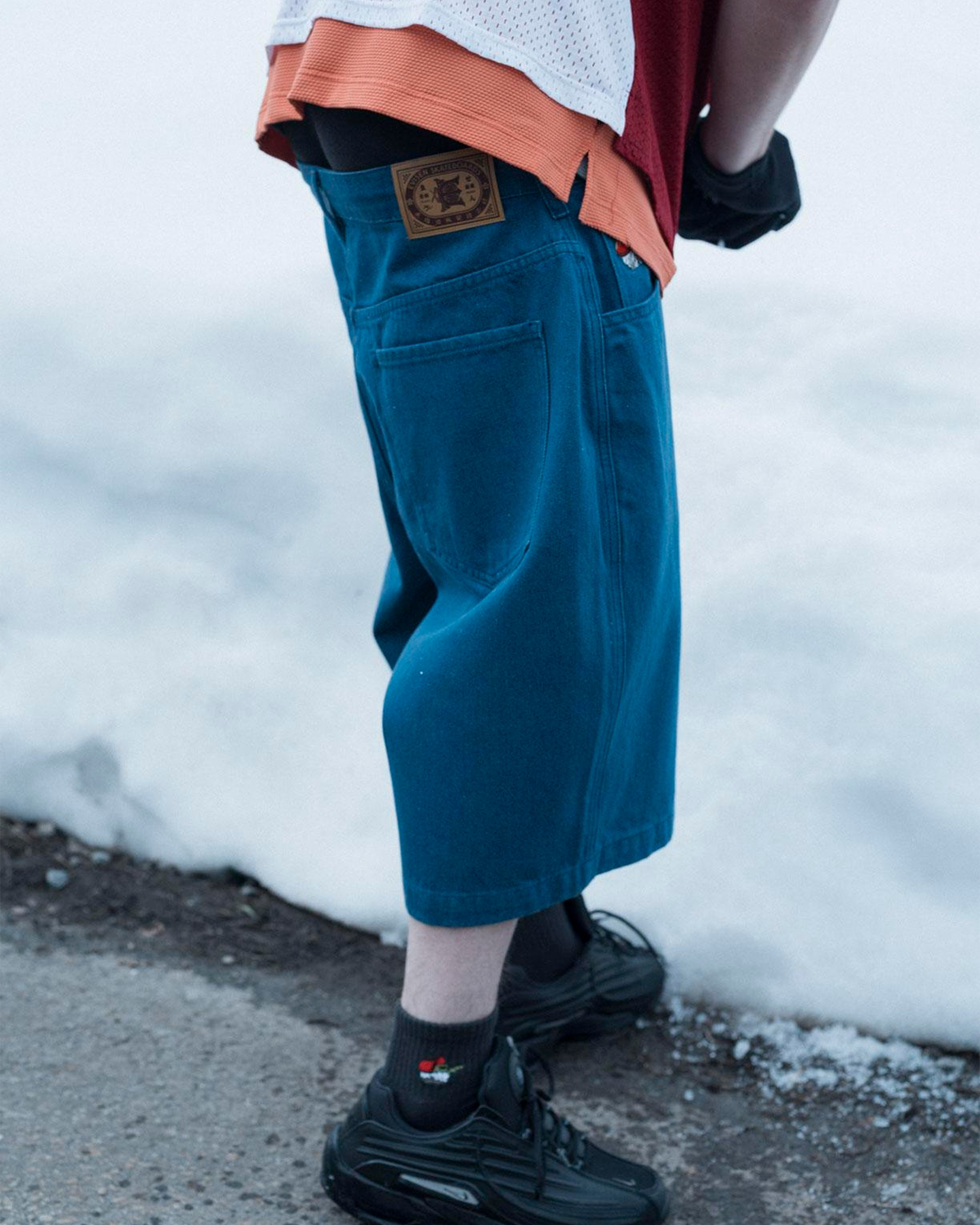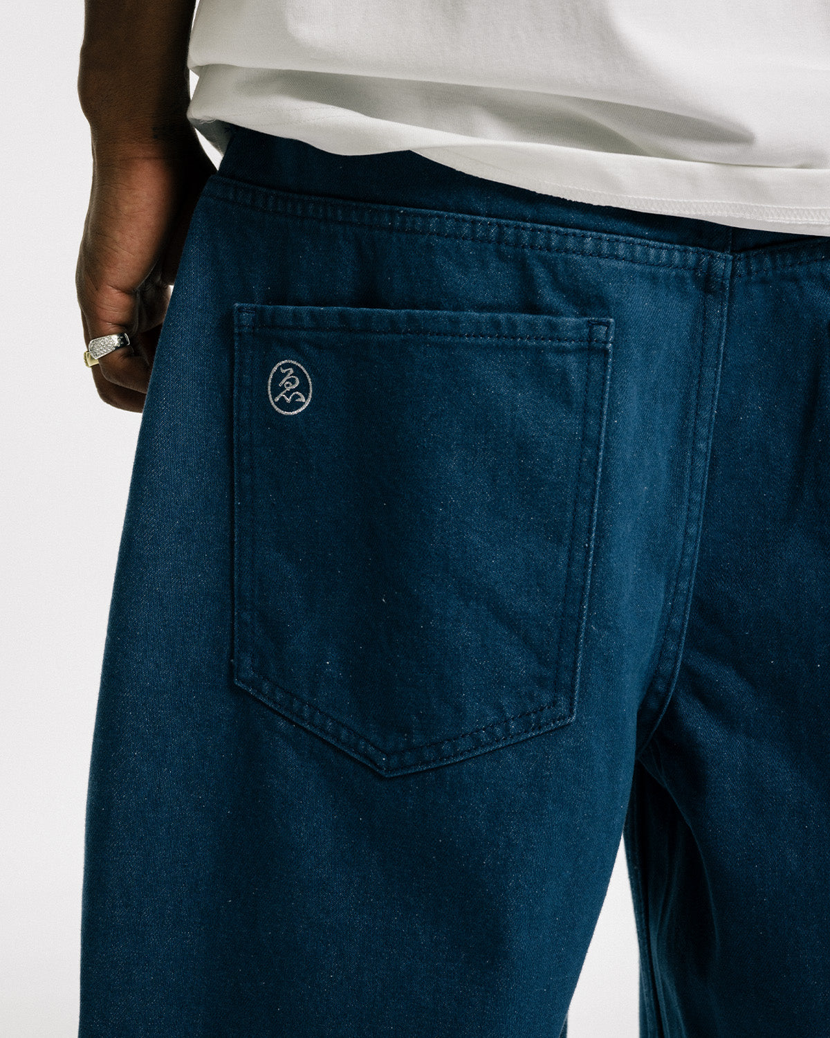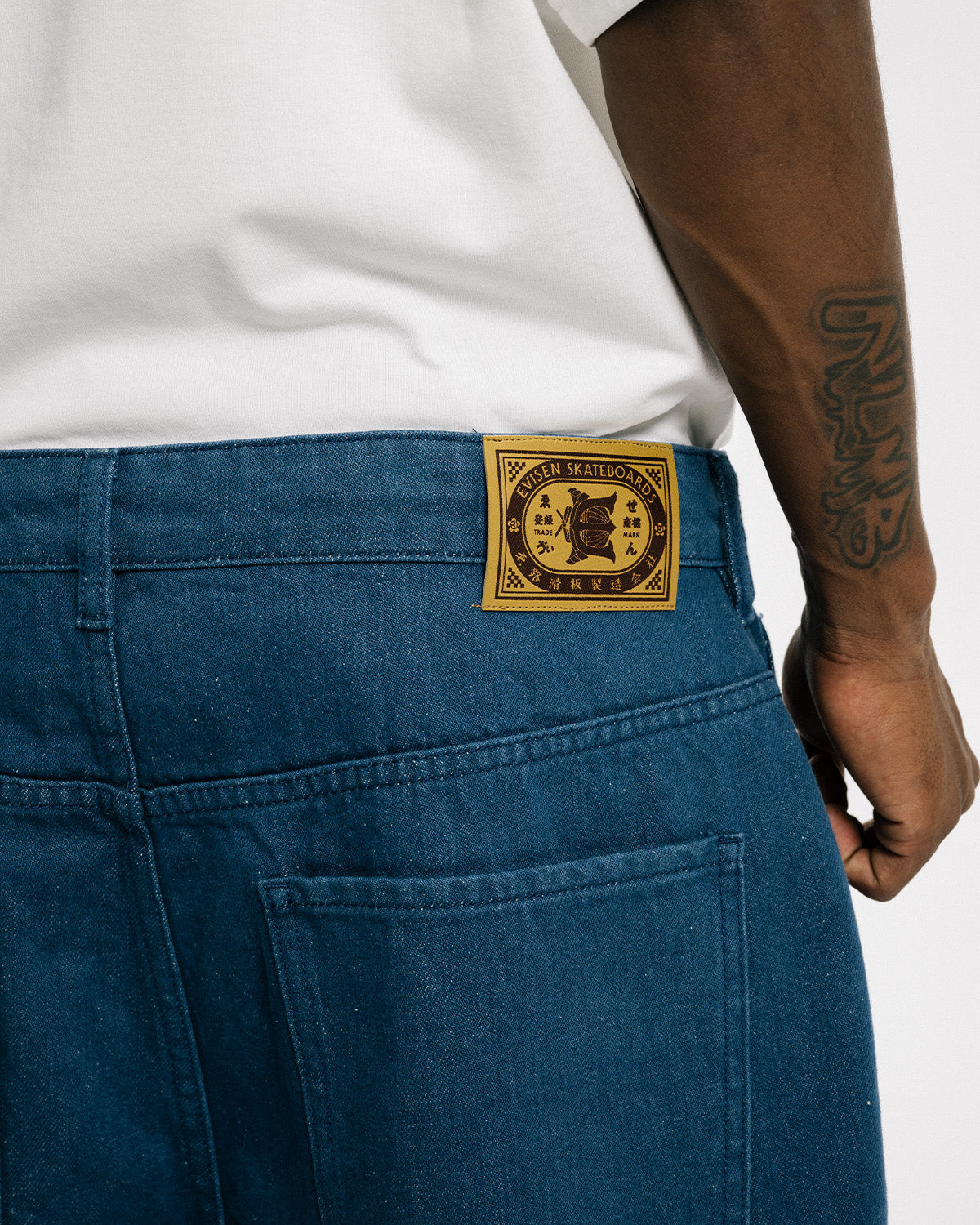 左バックポケット上にはいつものシルバーのゑ刺繍と、右腰バックにはオリジナルのレザー風パッチ付き。ゆったりしたシルエットです。
