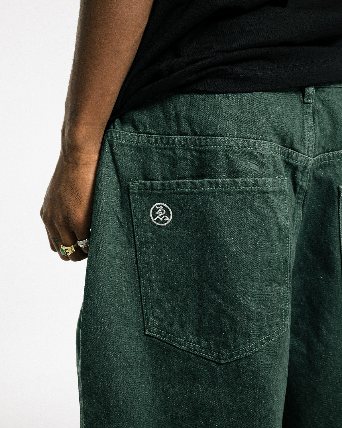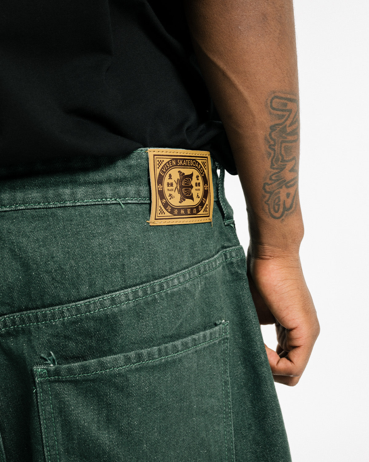 左バックポケット上にはいつものシルバーのゑ刺繍と、右腰バックにはオリジナルのレザー風パッチ付き。ゆったりしたシルエットです。