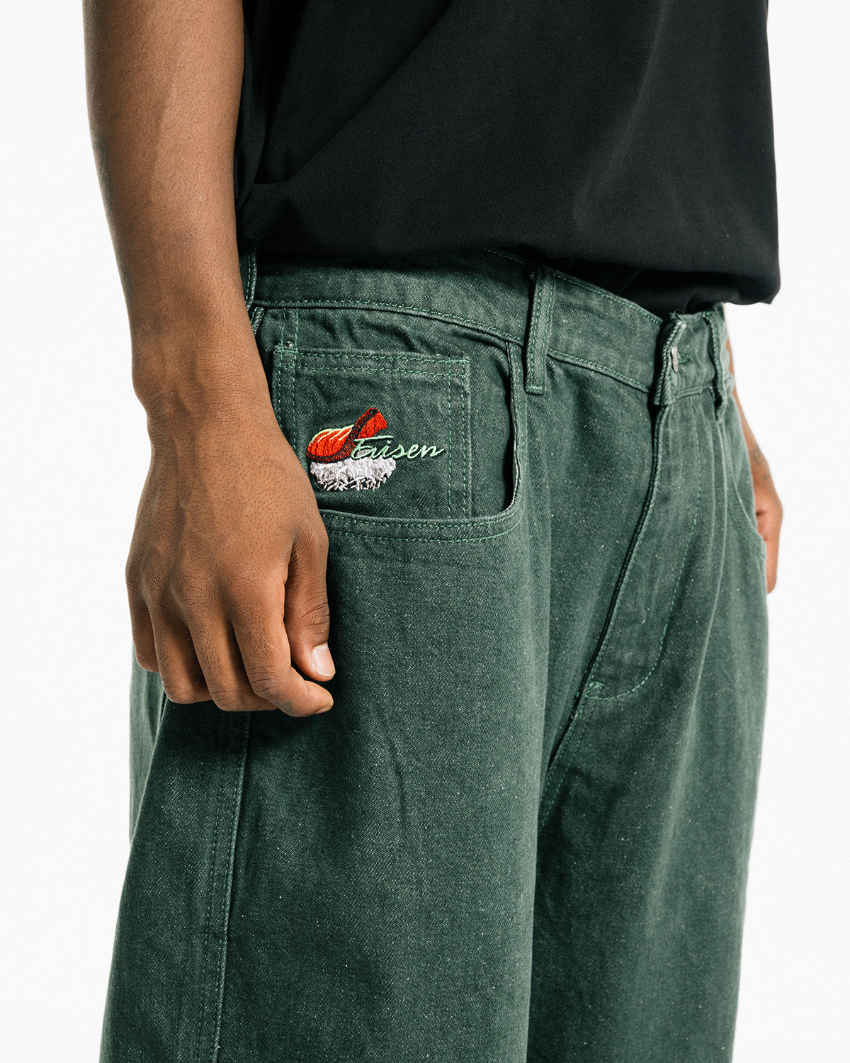 スシ刺繍入りのライトウェイトなコットンショーツ。ベーシックな5ポケットデニムスタイルで、コインポケットにスシ刺繍を施しています。
