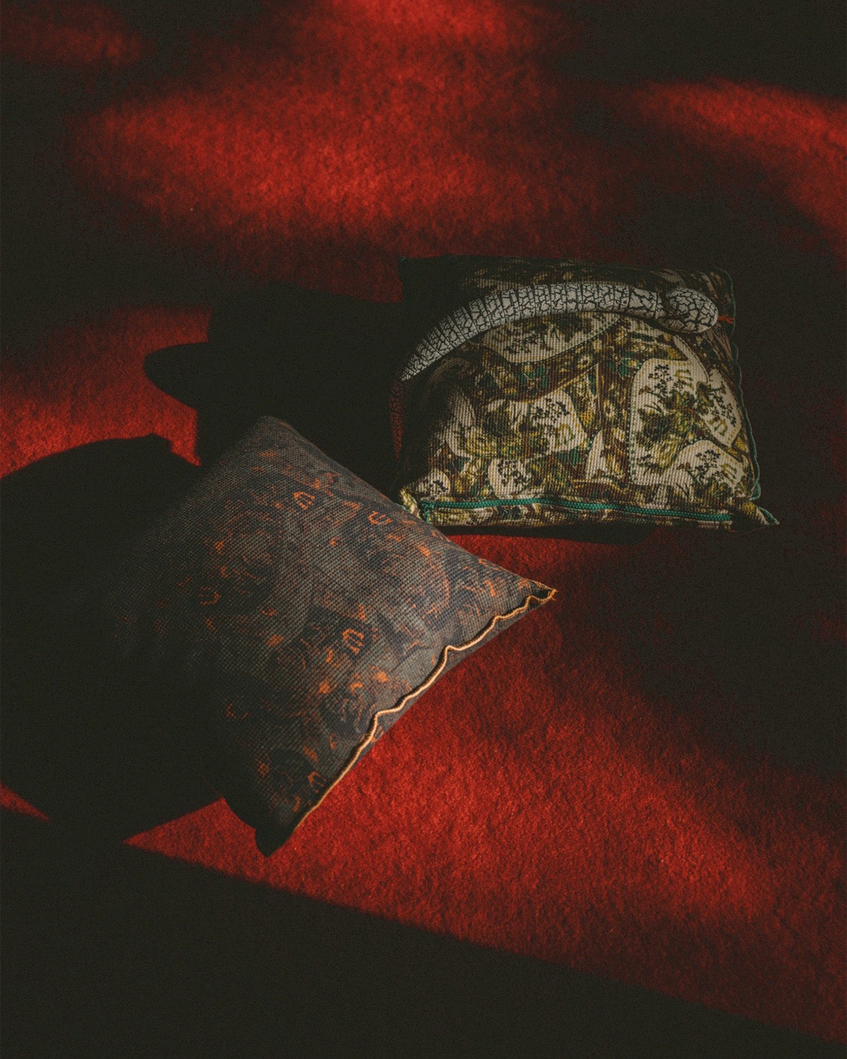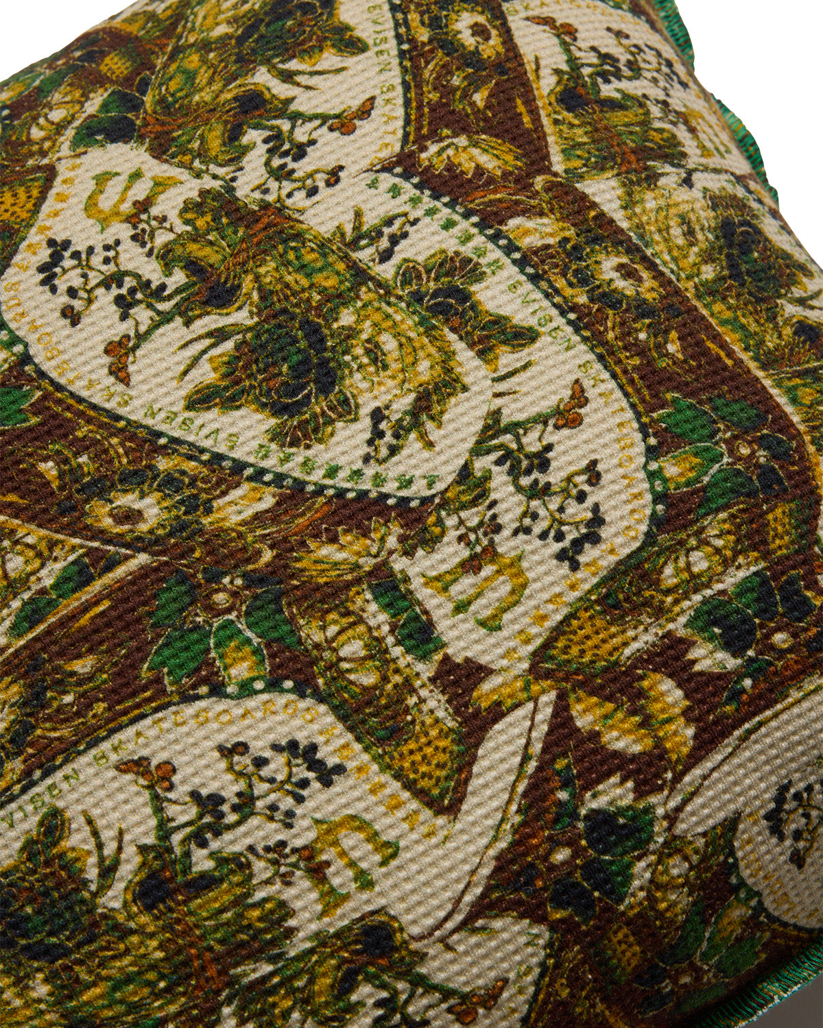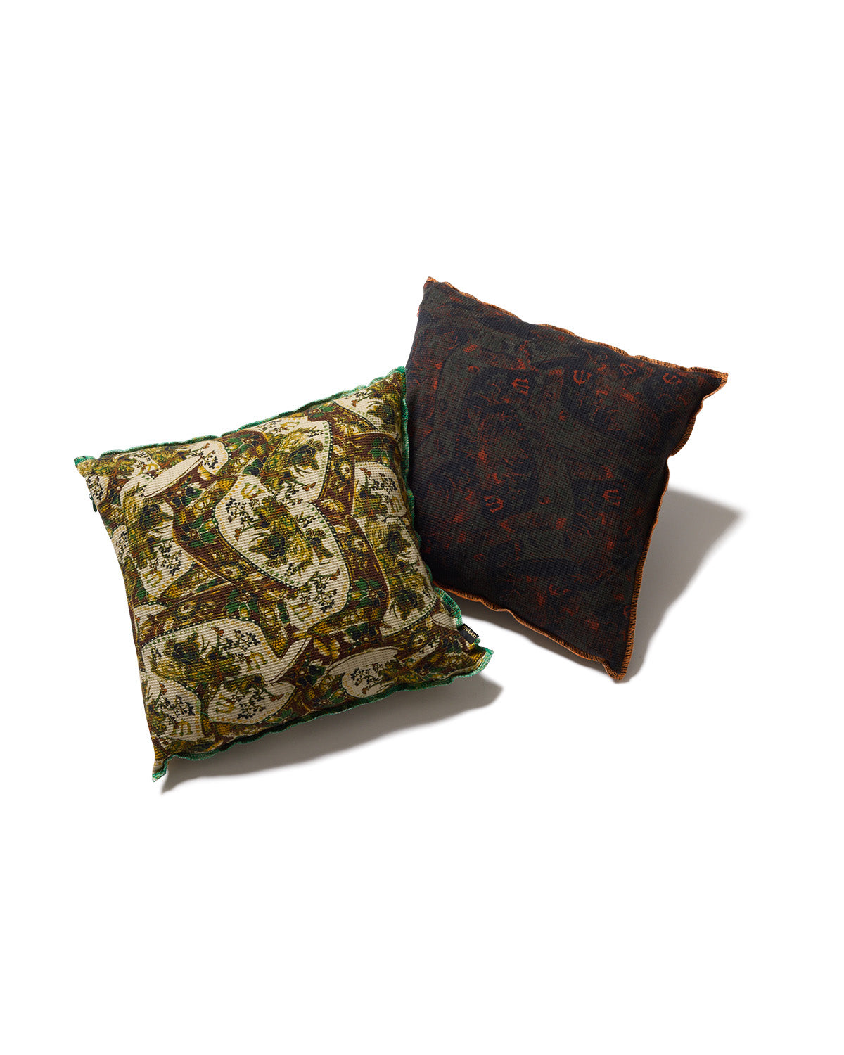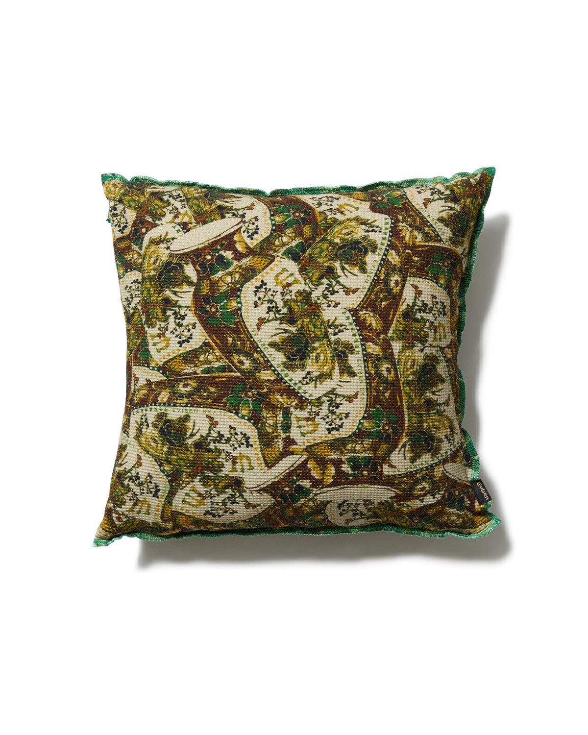 総柄Vaseグラフィックを、柔らかなサーマル生地にインクジェットプリントしたクッション。シームはアクセントカラーのロックステッチ仕上げです。